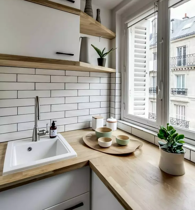 木材自然的紋理,偏向暖色調(diào)的色澤,讓你的廚房臺(tái)面獨(dú)一無(wú)二,木材容易切割,適合造型不規(guī)則的廚房空間。