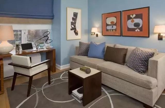藍色背景墻+藍色沙發營造視覺的統一性。
