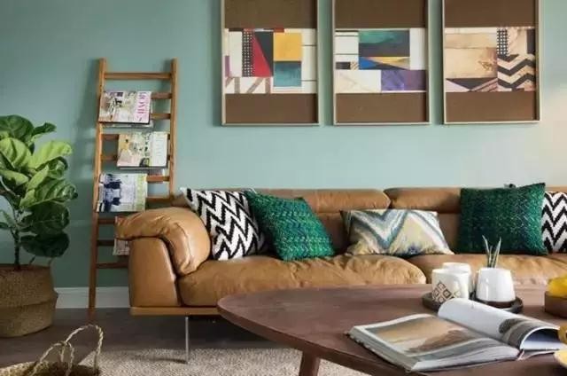 孔雀綠背景墻+褐色沙發營造自然輕松的空間氛圍。