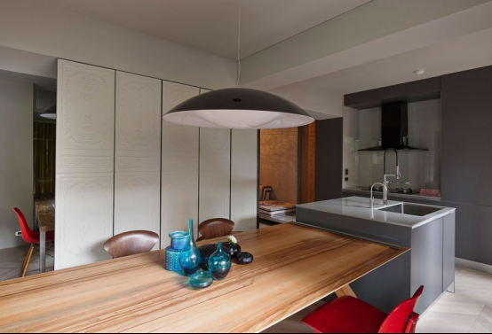 藍(lán)色花瓶、紅色座椅、淺灰色的吊燈也讓家變得跳動起來了。