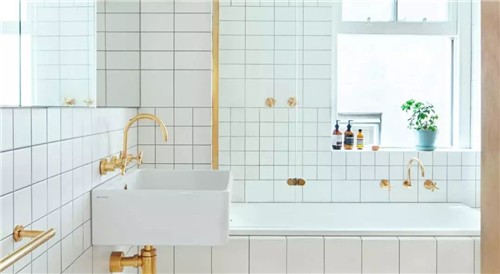 一個(gè)壁掛式水槽搭配金色黃銅龍頭