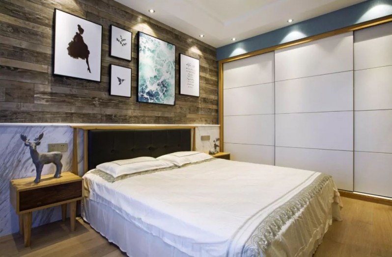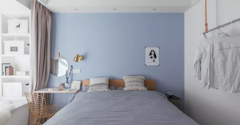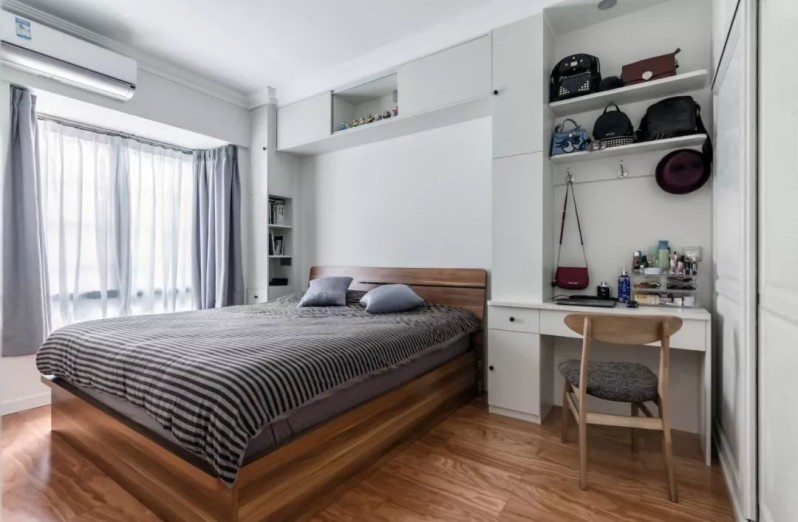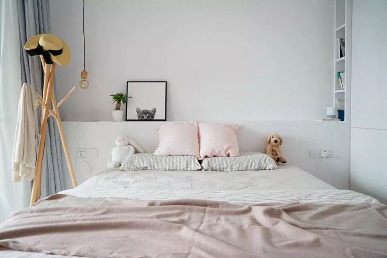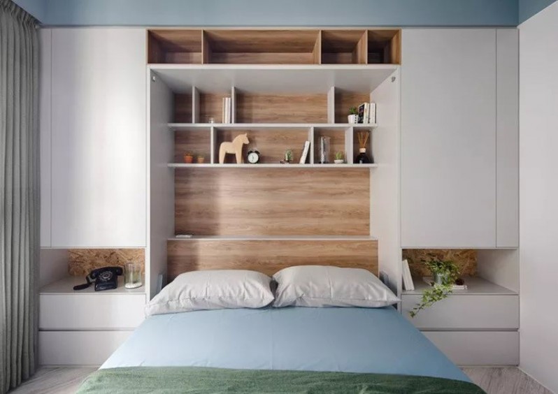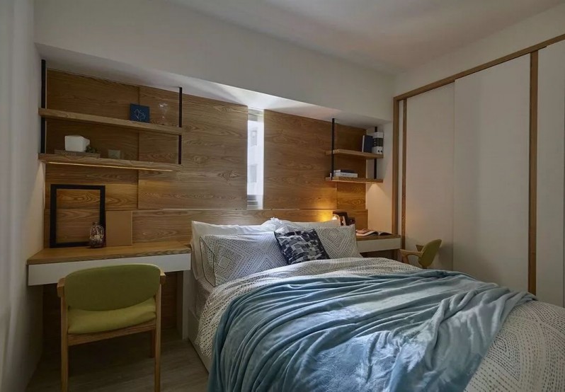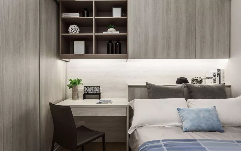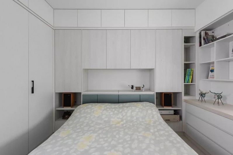 ▲ 寬度有限的小房間可以通過床頭背景設計收納柜體