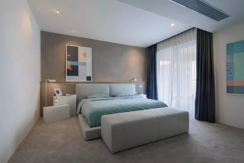 床頭背景除了大白墻之外,可以用彩色乳膠漆或者其他各種材料做立面造型,只要搭配得當,各種材料都可以發揮出很不錯的效果。