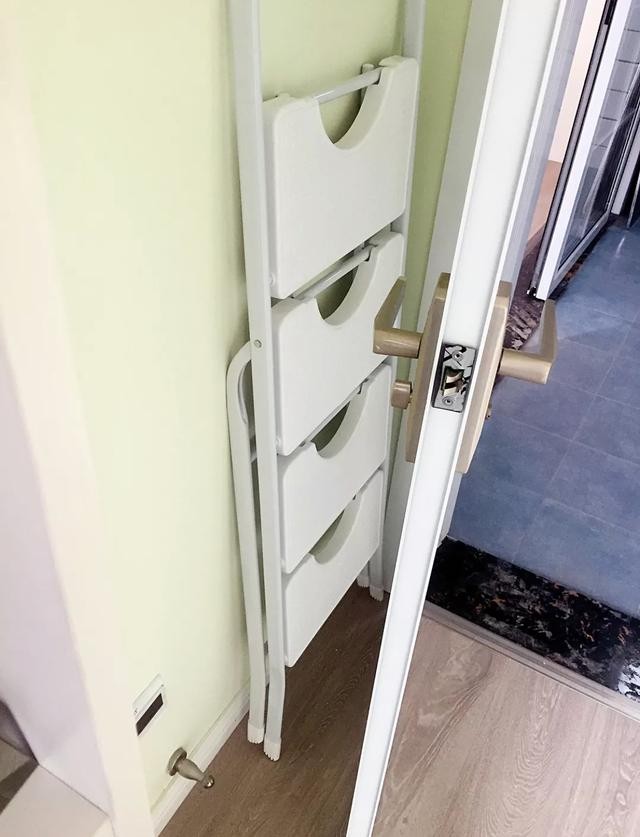很多戶型,留下的玄關,只是一個小過道或是根本無玄關,無法做鞋柜以及臨時收納,鞋柜恐怕只能另尋他處了,但是臨時收納(如包包,回來要隨手放)可以通過如下這種可折疊的梯子來解決