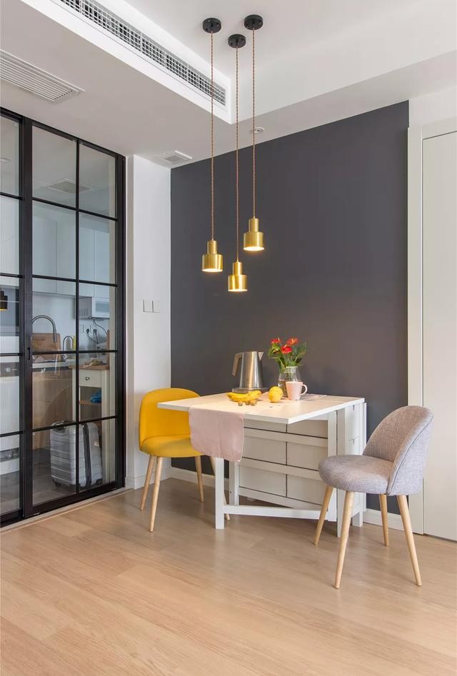 餐廚區域,小戶型將空間利用極致的方法是:開放式廚房。怎奈中國飲食文化,讓我們對開放式廚房心生三分畏懼。做了獨立的廚房,沒有足夠的餐廳空間,不妨考慮折疊餐桌,平時不打開它就是一個柜子。