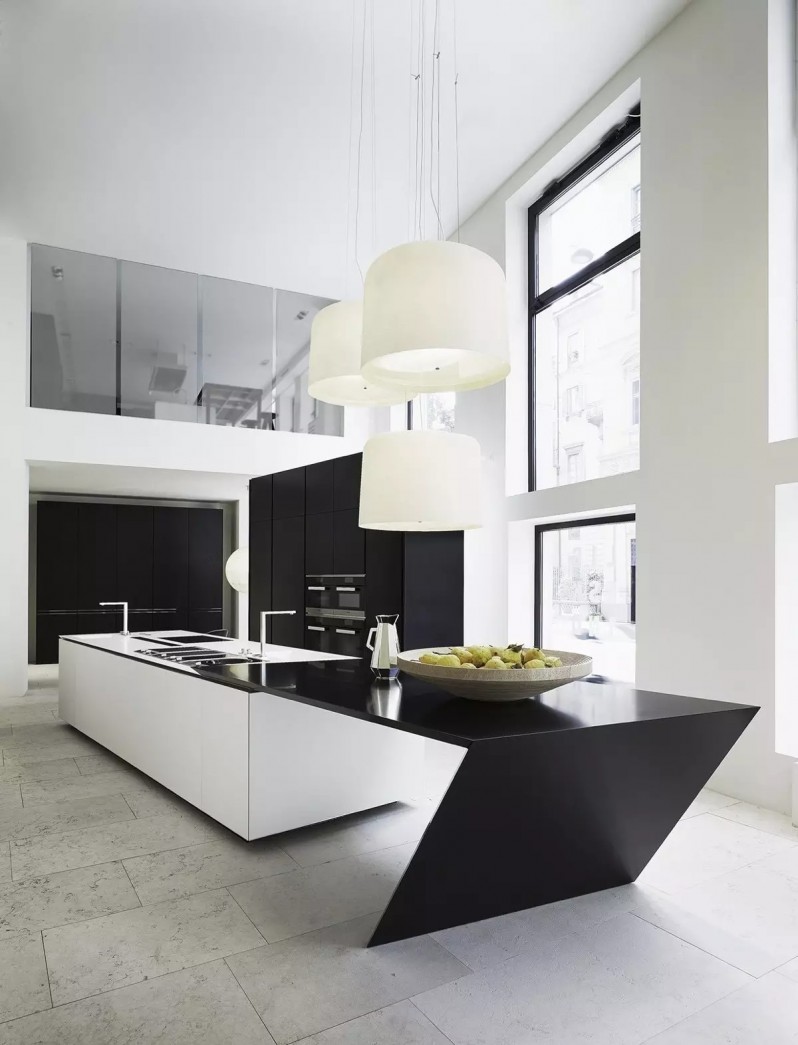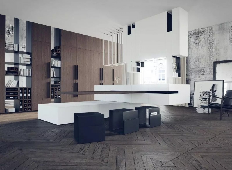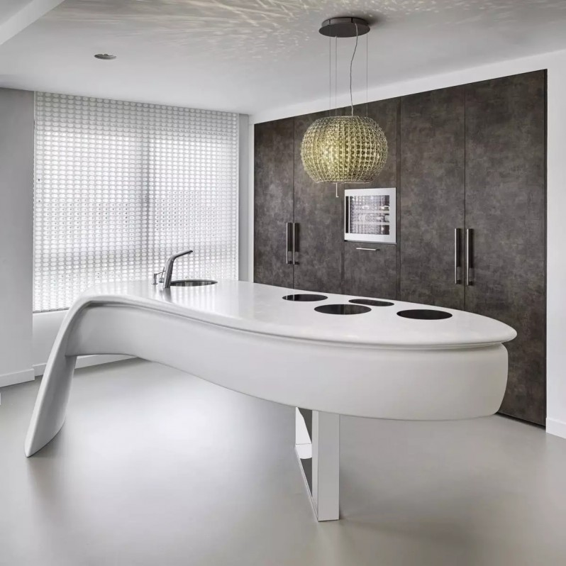 吧臺的不規則立面,無拉手設計,線條優美,貼合指尖曲線躍動自然。