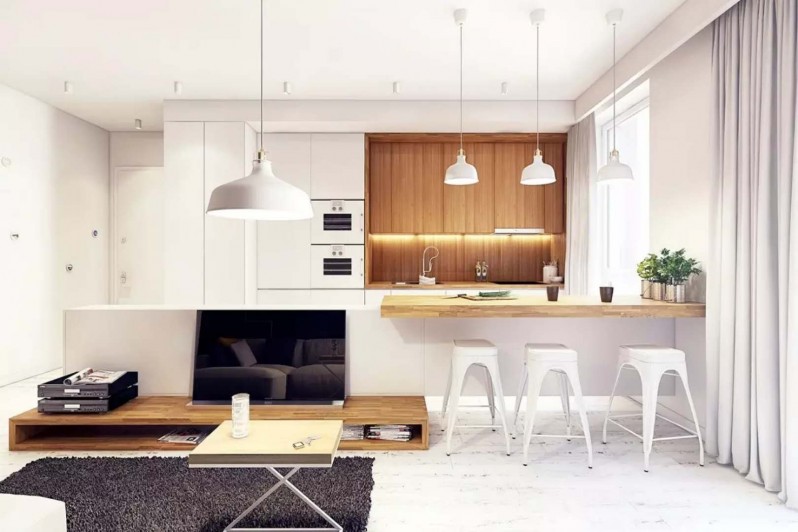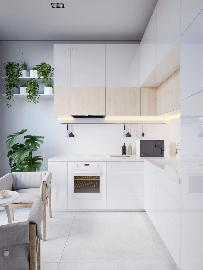 白色還是白色,但是不做裸墻,混搭式的柜體設計,再配上一小節的瓷磚,讓廚房更小清新,烹飪者的心情怎么會差呢?