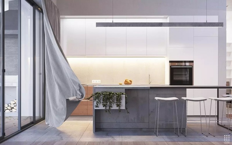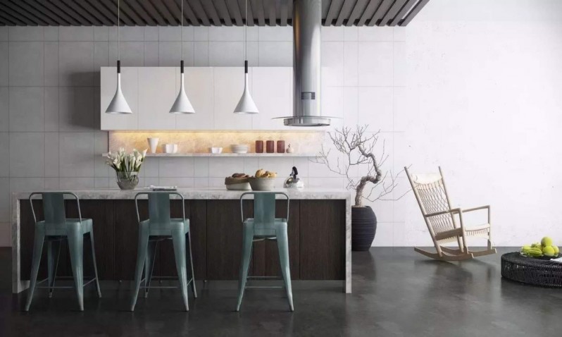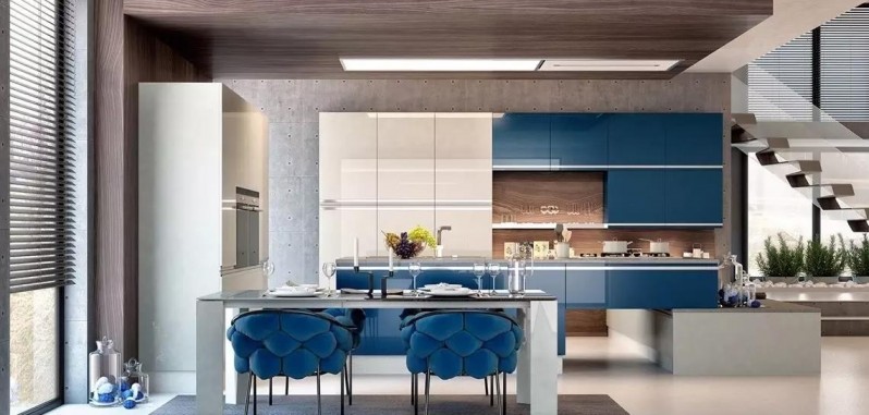 清淺的藍色和白色構置的廚房空間清新十足,空曠的開放式餐廚設計,空間現代風氣質十足。