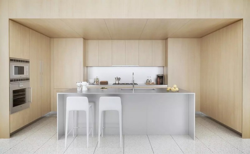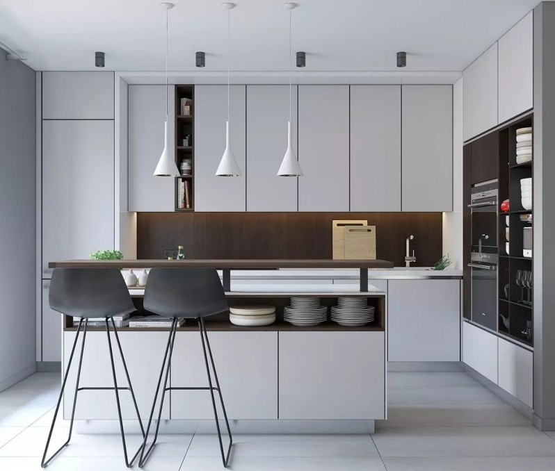 設計感十足的儲物柜,使廚房收納更加方便整潔。灰色的高腳椅與木質相互契合,給空間帶來一種大自然之感。