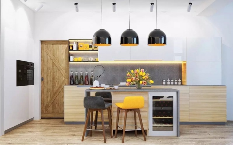 白+原木+黃色櫥柜搭配簡約、時尚風格的鏗固門窗,頗有歐式風情,整體效果很大氣,再加上造型獨特的吊燈,讓廚房設計簡約又不失個性。