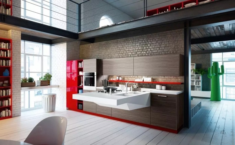 刻板的上面吊著柜子,下面也打一排柜子的廚房裝修