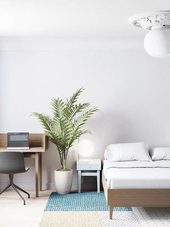 臥室不僅僅是睡眠空間,還是工作和娛樂空間。除了簡約的睡床之外,側面還做了一體化的木紋辦公桌,床對面則有電視柜,以及從電視柜延伸出去的梳妝臺。