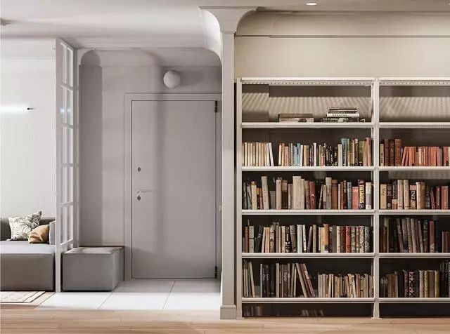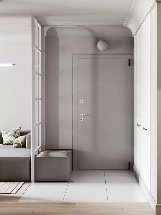 這是一個簡約時尚的單身公寓裝修案例,在現代簡約的外衣之下,其實頗有“禪味”內核。入門玄關做了一個具備收納功能的皮凳,另外用一道屏風隔開玄關和客廳沙發區。