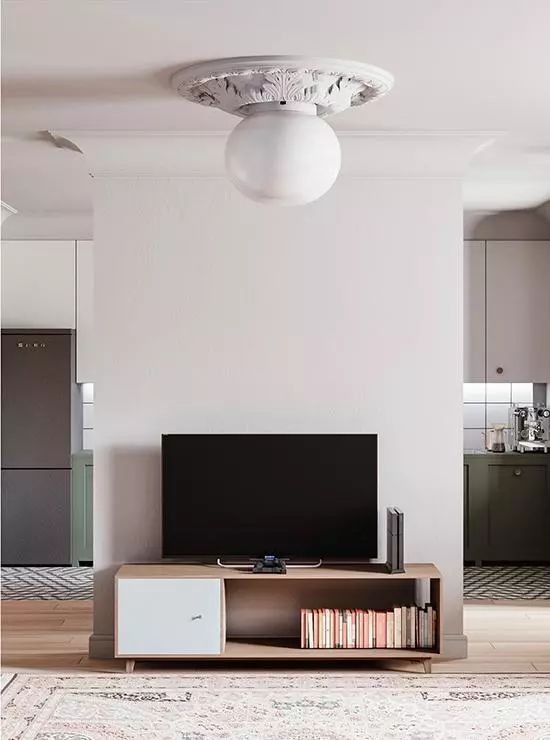 客廳用了灰色的極簡主義模塊化沙發,對面則是簡潔的電視柜, 木紋框架,白色門板。整個客廳的構造非常簡單。