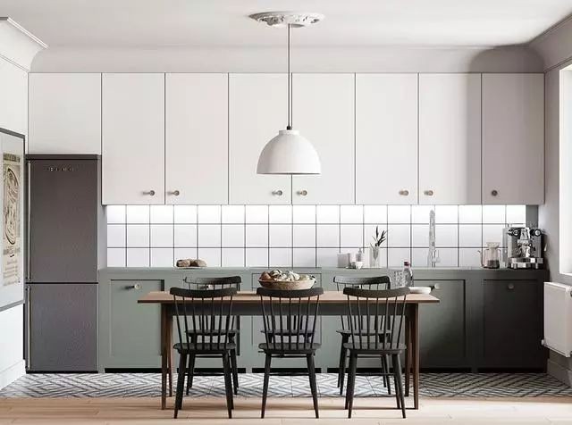 客廳電視墻背后則是廚房和餐廳,廚房吊柜部分均為白色面板,還有白色的格子瓷磚防濺擋板,地柜則是綠色的。廚房地面簡潔的幾何圖形瓷磚,與餐廳的木地板形成有趣的過渡。餐廳木紋風格的長方形餐桌,搭配六張灰色的餐椅,別具一格。