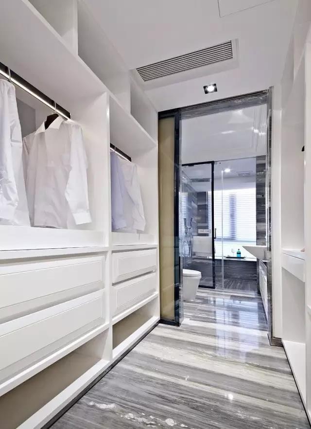 主衛(wèi)的通道,甚至是衛(wèi)生間原本的干區(qū),都可以改造利用起來(lái),把主衛(wèi)門外的兩側(cè)裝成步入式衣帽間,這樣利用也是不錯(cuò)的選擇。