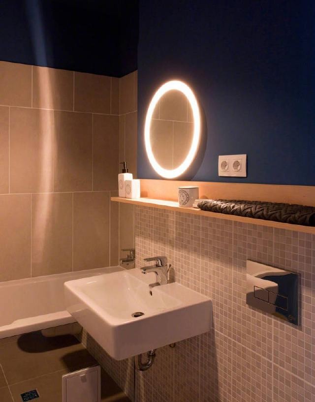 廚房的墻面還是采用大面積的深藍,櫥柜等設計都是極簡