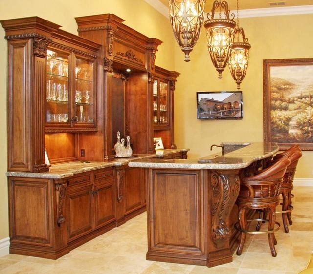 如果你家家具都是實木的話,可以考慮搭配實木吧臺,比如奢華歐式風格或者日系清新淡雅的風格,木質吧臺都是很好的選擇。