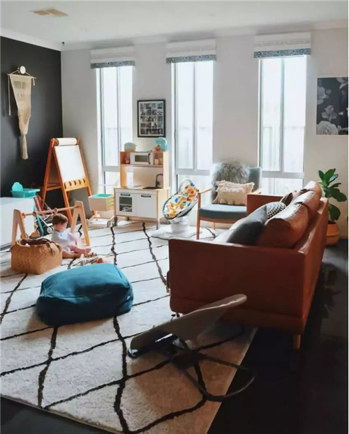 ▲客廳是一個讓人放松的空間,舒適度永遠(yuǎn)是居于首位的。對于愛看書的大人來說,躺在懶人沙發(fā)上悠閑地看看書,旁邊是孩子在自在的玩耍,兩個人既有親密的親子時光,又能保有各自的興趣,互不打擾,也是一種溫暖的陪伴。