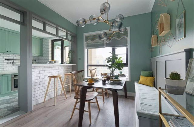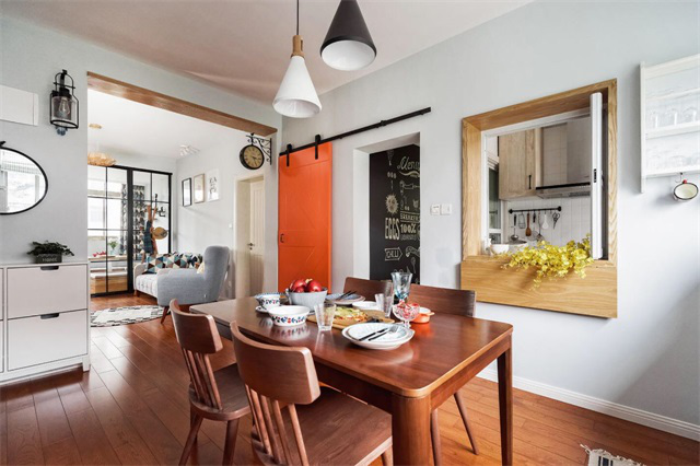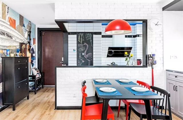 室內(nèi)每一個空間之間并不是完全獨立的,相互之間應該有更多的互動。類似這樣在廚房開個窗洞,能享受開放式廚房的優(yōu)點,比如視野好、采光好、互動好,又可以通過窗戶或者玻璃來隔絕油煙問題。想象一下一家人有人在做飯,有人在餐廳擺餐具,孩子在客廳玩耍,都能相互看到,家庭溫馨感提升不少。