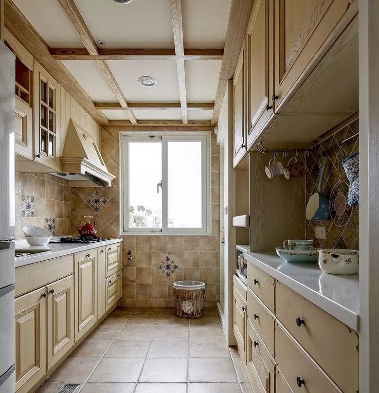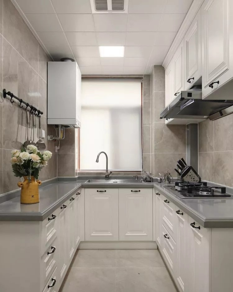 廚房門開在廚房中間的話,建議這種過道型廚房可以設計成二字型布局。這樣布局不僅合理,并且空間利用率極高。