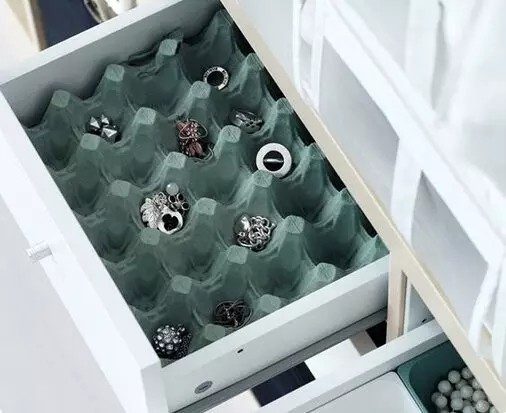 首飾收納最重要的就是獨立存放,避免打結。存放在抽屜中,放一個蛋盒就能安放心愛的首飾,太機智~