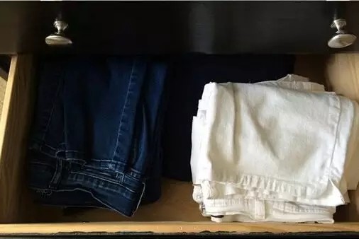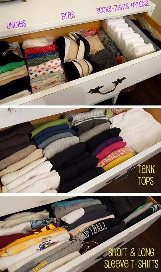 當然,如果你懶得做隔板,直接將衣物卷成條狀排列放置,這樣也比折疊堆放來得方便~