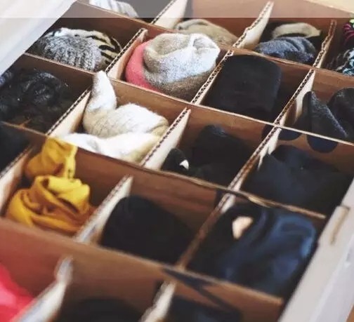 像背心、T恤這類比較薄的衣物也可以用分格抽屜進行整理,用平時包裝用的瓦楞紙做成縱橫相間的隔板更方便放置。