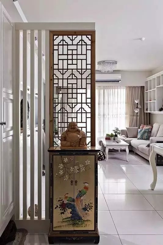 是以隔斷下部為完全遮蔽式設計。隔斷兩側隱蔽無法通透,上端敞開,貫通彼此相連的天花頂棚。半敞半隱式的隔斷墻高度大多為l.5m,通過線條的凹凸變化、墻面掛置壁飾或采用浮雕等裝飾物的布置,從而達到濃厚的藝術效果。