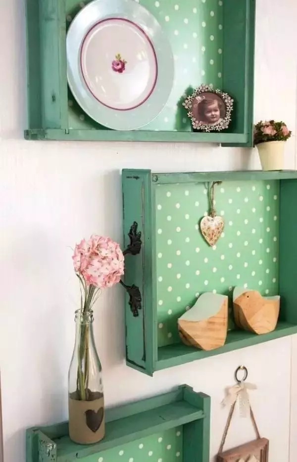 將抽屜噴上自己喜歡的顏色,安裝在墻面上,擺上自己喜歡的小飾品,一個兼具美貌、獨(dú)特于一身的置物架完成。