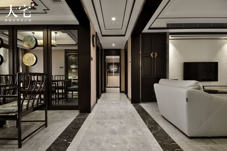▲一入戶門,入目的便是一對掛畫,似看是圓卻非圓;與傳統中式玄關不同的是,現代背景演繹下的新中式不再鐘情于繁瑣與沉悶,而是將傳統元素和現代元素相互融合,相得益彰,勾畫出打破傳統卻又不顯突兀的美感。