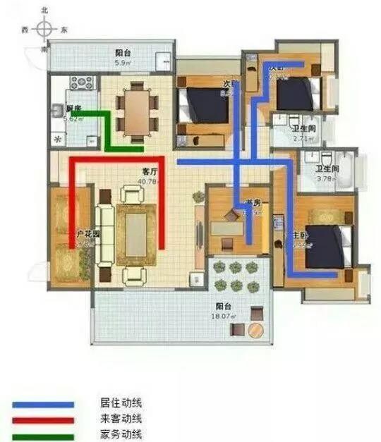 家居動線主要有三條:居住動線、訪客動線、家務動線。路線的設計應盡量簡潔,避免低效率的活動范圍。