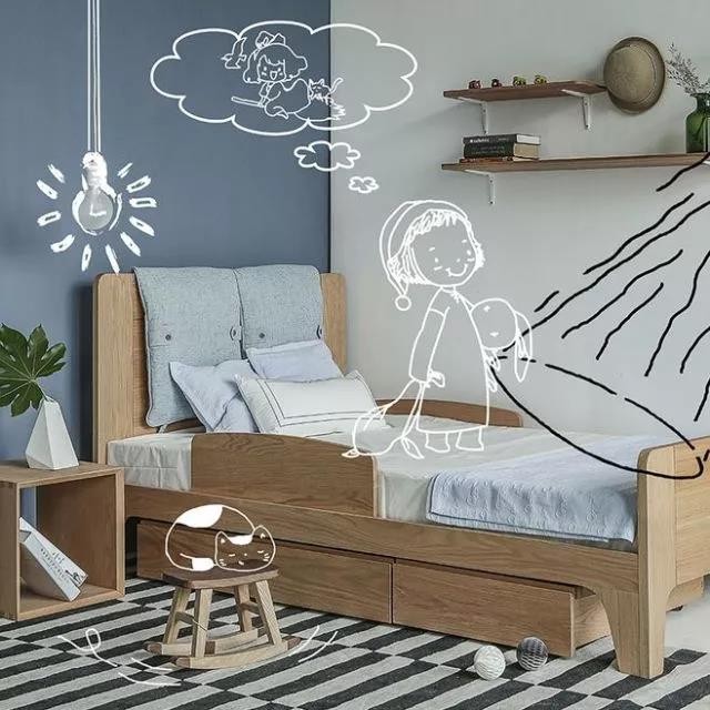 讓孩子擁有一張屬于自己的床,安全環(huán)保的實(shí)木材質(zhì);即便隨時(shí)翻滾也不擔(dān)心掉下來(lái),床下還有很多大的抽屜,可以裝各種玩具,用泥巴捏的小狗,以及各種糖紙,偷偷藏起來(lái),這就是屬于他們的秘密。