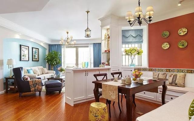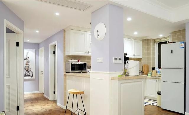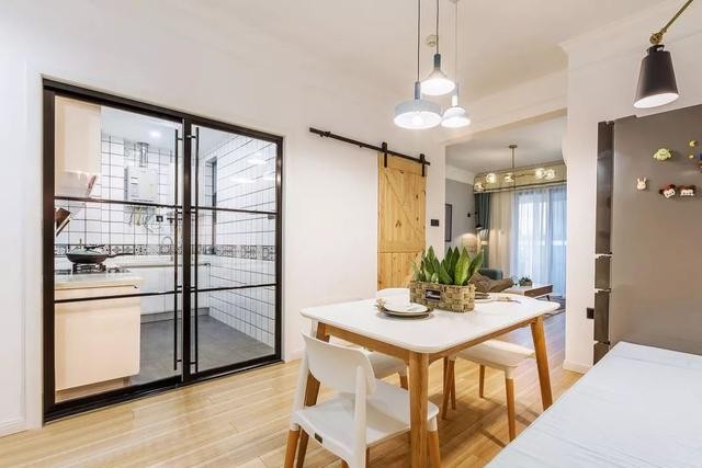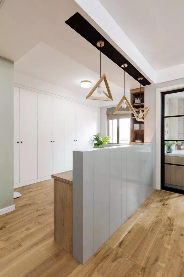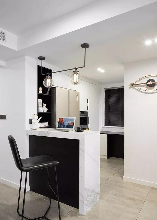 不知道廚房區域如何分割?除了推拉門之外,喜歡開放式廚房的朋友則可以選擇做個小吧臺,它也可以成為用餐區,這樣一來不僅貌美而且有效提高了空間利用率。