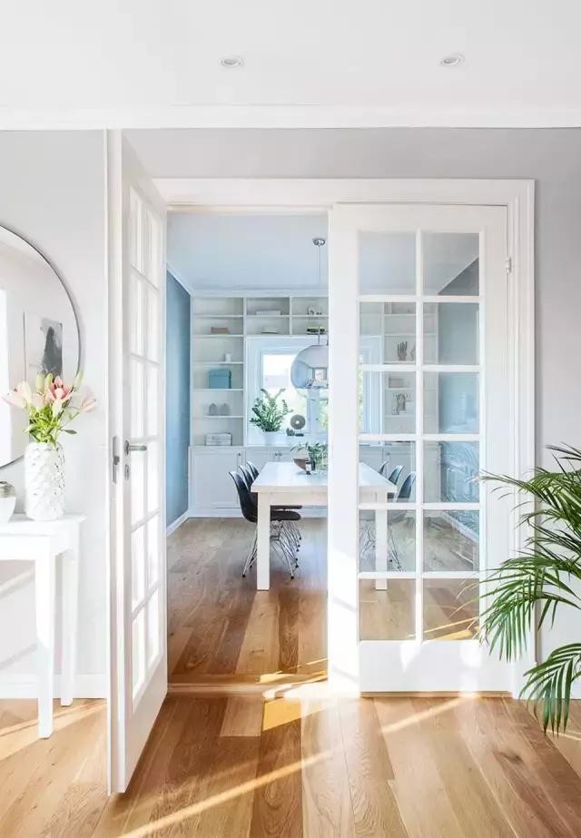 客廳正前方就是餐廳的所在,用玻璃門替換掉原來的木門能讓餐廳顯得敞亮不少,而窗邊的那個柜子既能儲物還兼具裝飾的作用。