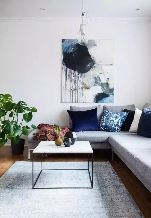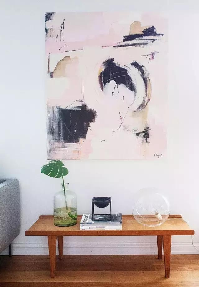 在客廳另一面墻上掛上了一幅主人自己的畫作,加上一張長凳和一些裝飾