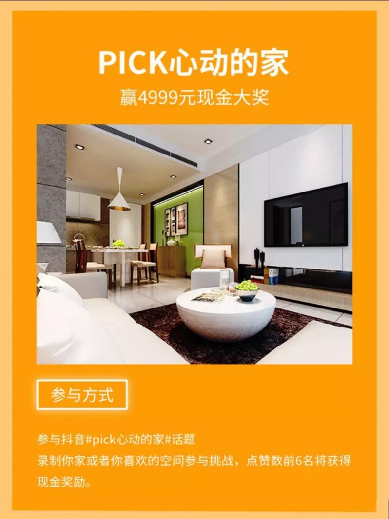 當然,除了這些豐富的店慶豪禮外,還準備了贏4999元現金大獎,參與抖音#pick心動的家#話題,錄制你家或者你喜歡的空間參與挑戰,點贊數前6名將獲得現金獎勵。