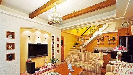 七十平米的復式樓客廳可以做成挑空的,墻面可以用溫暖的黃色,茶幾和電視柜的顏色和款式可以選素一些的,比較好清洗,而且比較耐臟,沙發可以選擇亮色一點的,作為客廳的一個亮點。