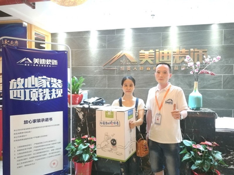 上圖為人氣工地評(píng)選獲得一等獎(jiǎng)的業(yè)主江女士和項(xiàng)目經(jīng)理李勝利的領(lǐng)獎(jiǎng)合照,萊迪智能桌面機(jī)器人很萌有沒(méi)有?江女士還說(shuō)孩子肯定很喜歡它,要早早把它帶回家呢。