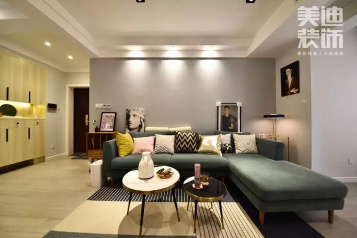 整體的設計上,硬裝無需做太繁雜的造型,關鍵在于軟裝的搭配來營造北歐的溫馨雅致風情。因為男主人忙于工作,家中的軟裝基本是女主人一手操辦。柔軟的灰藍色沙發搭配深灰色地毯,亮色靠枕、木質柜體等色彩的跳躍給空間帶來更為豐富的層次感覺。