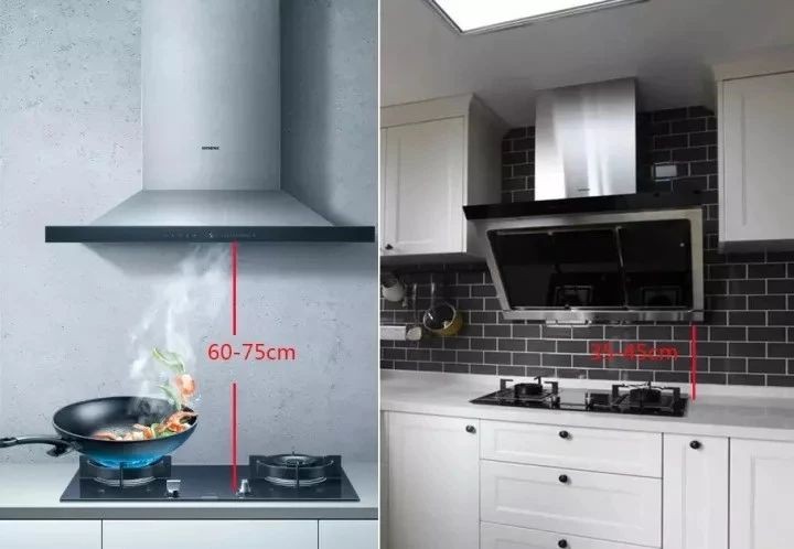 這里講一下油煙機(jī)離灶臺(tái)高度,頂吸式安裝高度在距離灶臺(tái)的65-75cm間;而側(cè)吸式油煙機(jī)底部距離灶臺(tái)距離可以更近,一般在35-45cm間。