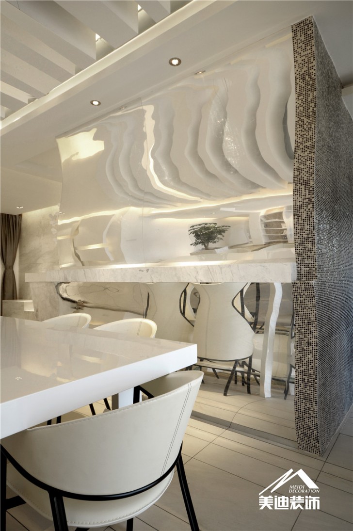在空間各個角落吐息,白色石頭, 白色皮草,白色涂料、白色鏡面、白色織物及白色木紋,通過位移、分割、重組、加上光影,演繹著各種立體的變化
