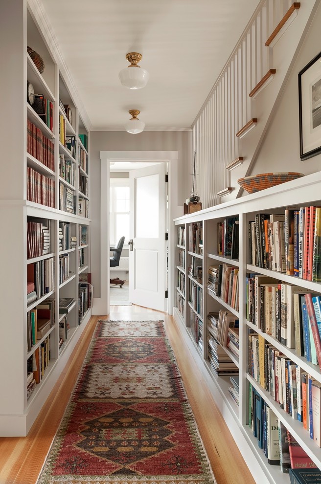 小戶型騰不出書房的空間,走廊就要好好利用起來,整墻書柜或者簡單的書架,都能讓你的藏書有容身之所。