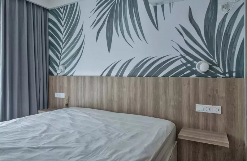 主臥木色床頭延伸出對稱置物臺,上方鋪貼綠葉墻布,兩盞壁燈小巧而賦有趣味。
