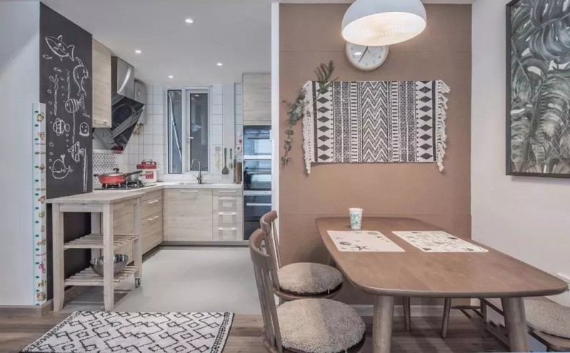木作餐桌餐椅,搭配白墻,清新美觀。
