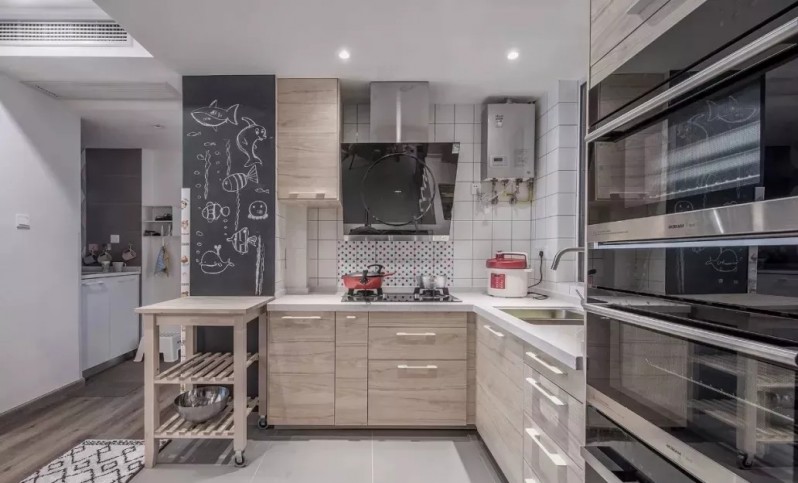 開放式廚房,地面鋪灰磚,墻面鋪小白磚,搭配木色柜門,自然而溫馨。