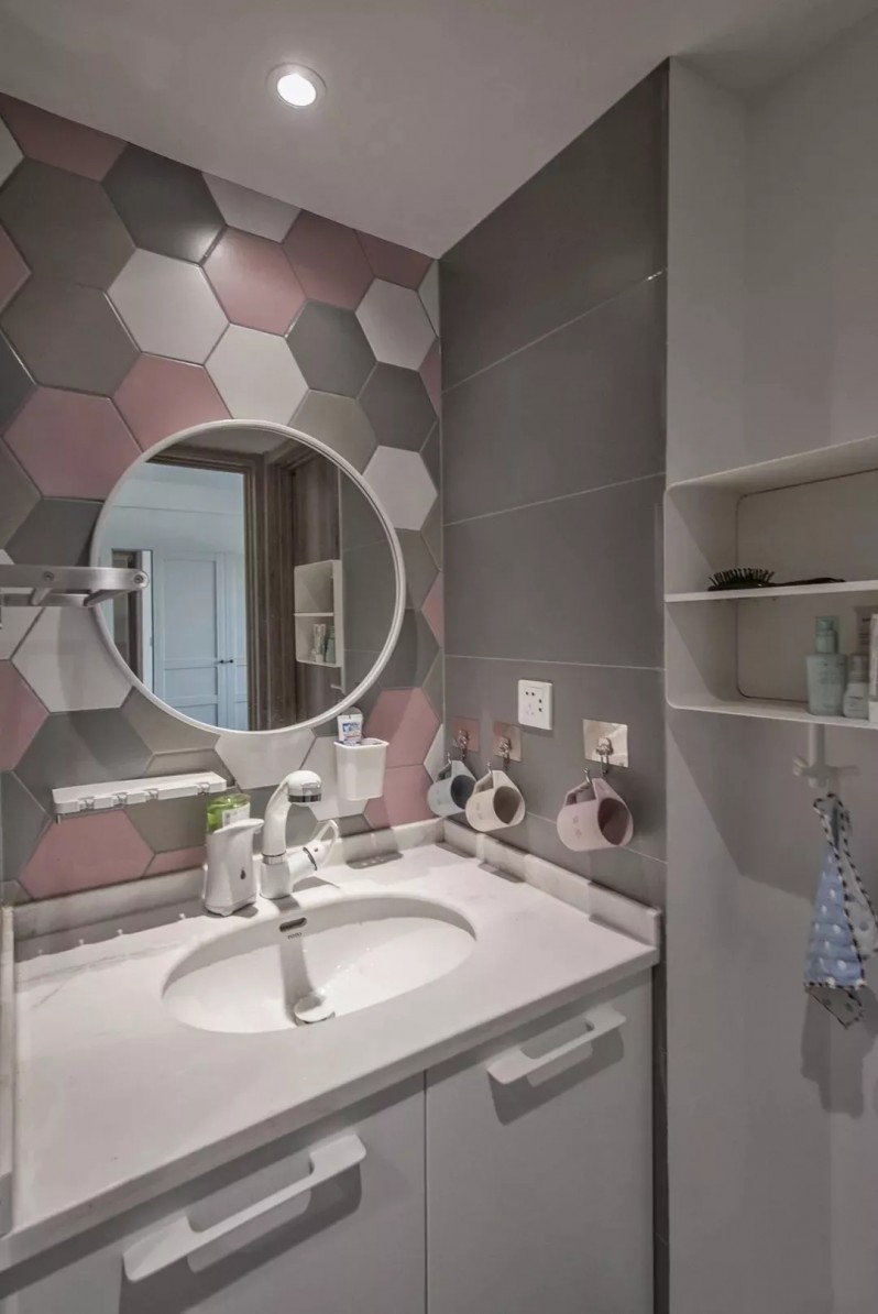 衛(wèi)生間干濕分區(qū),拼色六邊磚搭配圓鏡,搭配出俏皮背景。