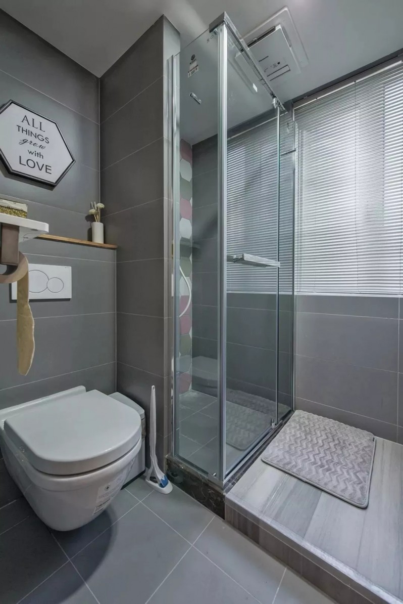 淋浴區(qū),六邊形拼色瓷磚與干區(qū)呼應(yīng),墻排馬桶上方加入木面置物臺。