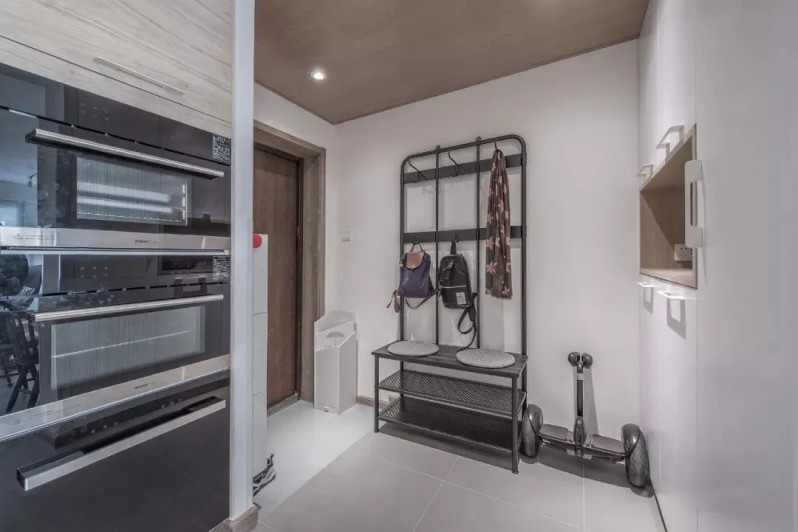 原始戶型開門見廳,設(shè)計師在正對門的位置安裝了一道白色儲物柜,隔絕視線的同時,提高了空間的儲物能力。