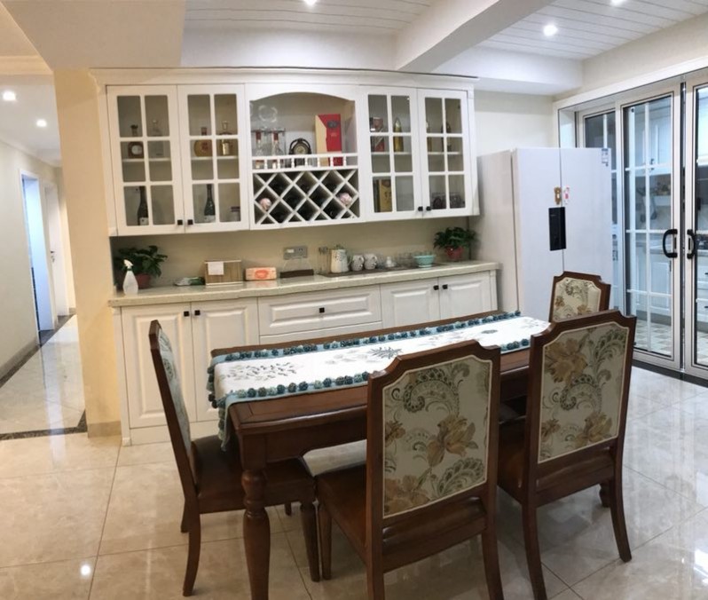 廚房空間有限,為了擴大廚房的操作空間,冰箱放在餐廳,與酒柜融為一體,功能與美觀兩不誤。在餐廳空間允許的條件下,設置定制酒柜來容納楊姐隨時的一些東西。其中,吊柜的多種造型滿足不同種類的物件擺放。